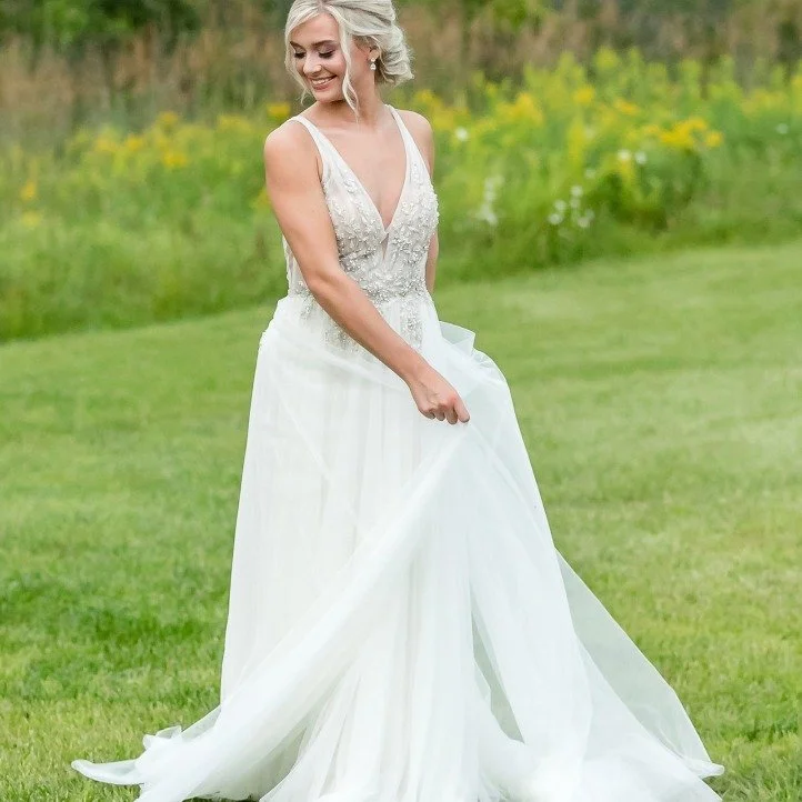 An A-line silhouette is one of our favorites because it’s truly the most comfortable fit! It flatters all body types, accentuating the smallest part of the waist. This style gives you a sleek, slimming look without feeling snug through the hips. Fabrics like chiffon, soft tulle, and organza give the skirt just enough volume without feeling extra heavy or poofy.